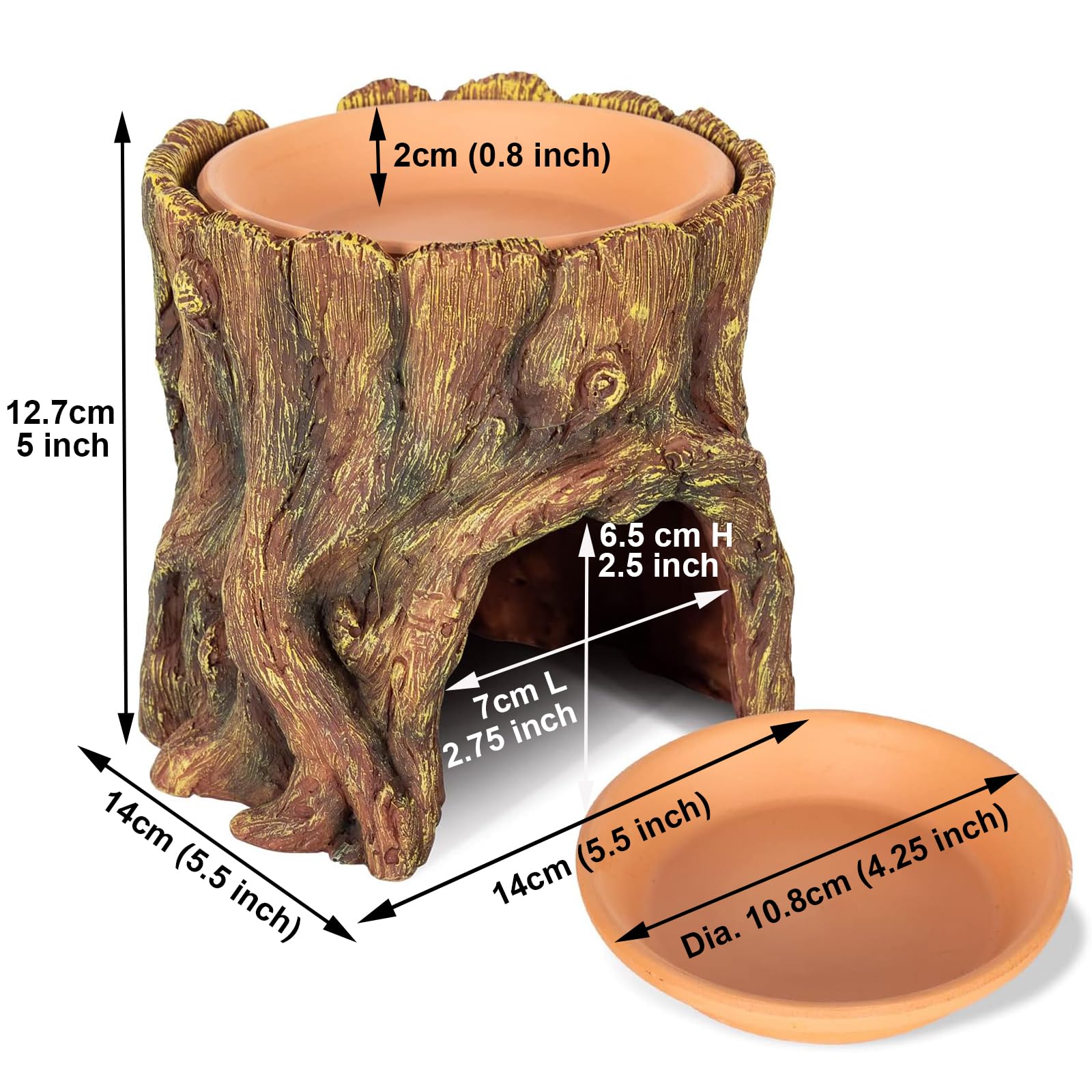 - 【3 in 1 Reptile Cave】Provides comfortable and secure hiding place, add water in terracotta dish to effectively increase the humidity of the reptile home, resin base also can be used as food dish, both are detachable, Meet the various usage needs of small reptiles
