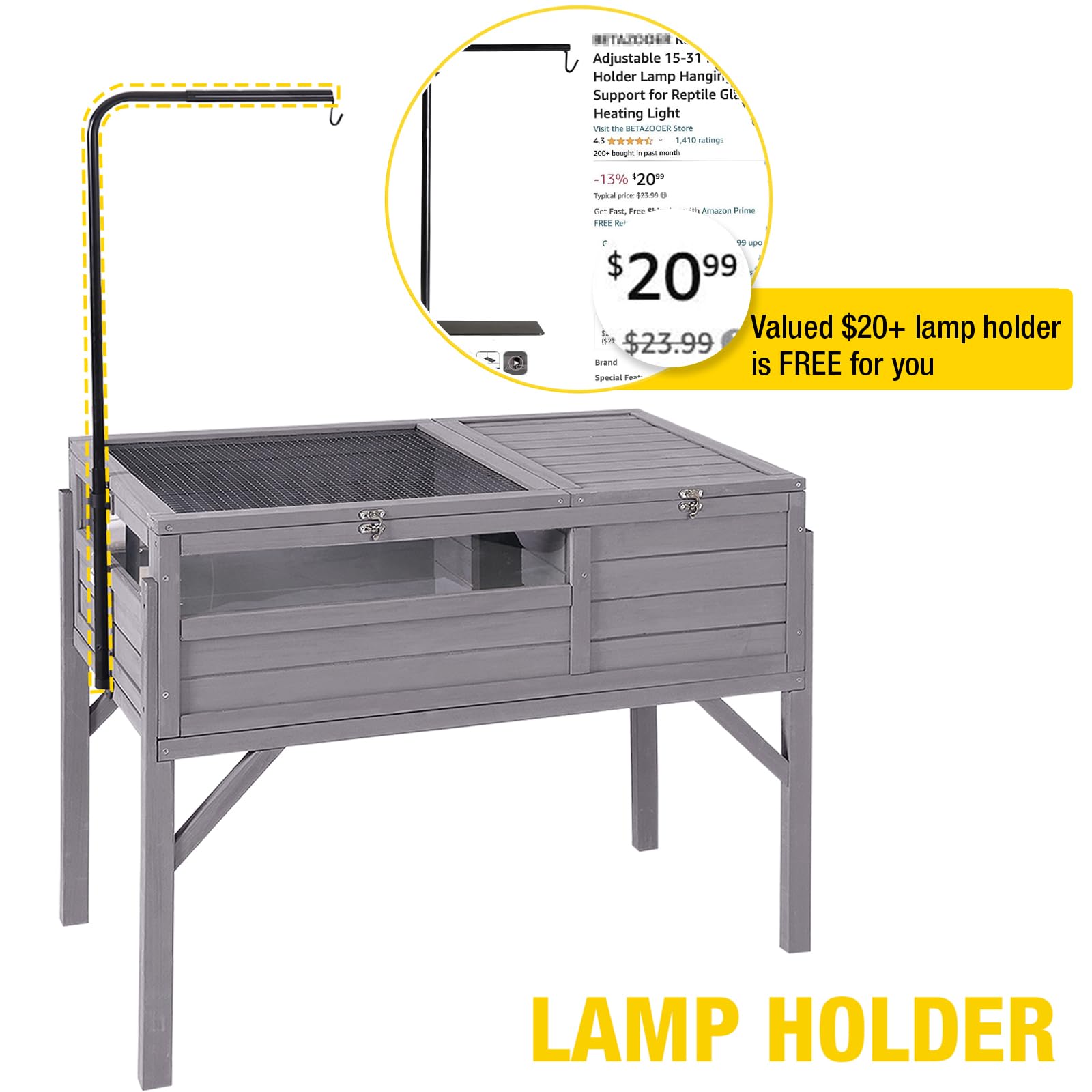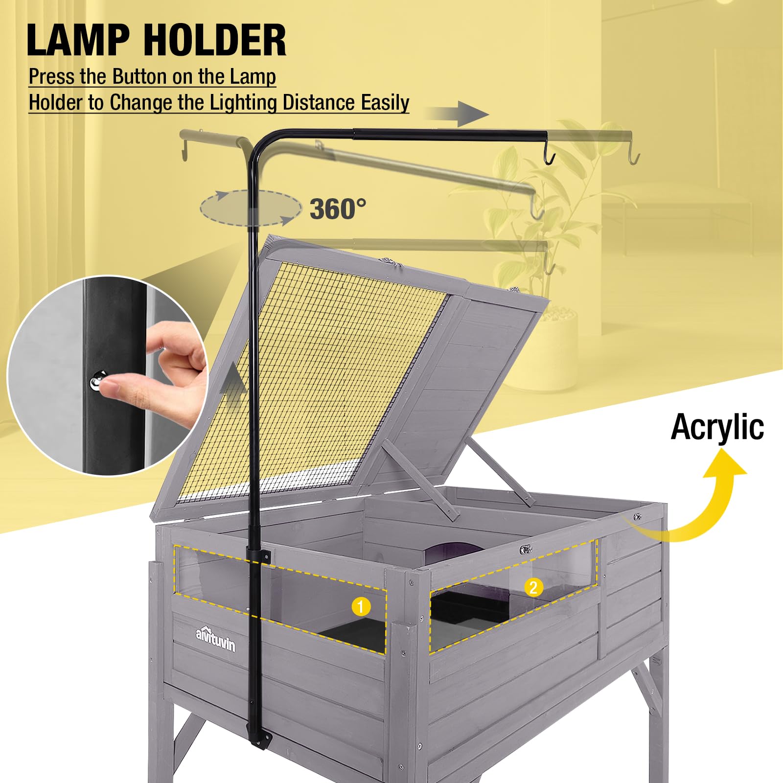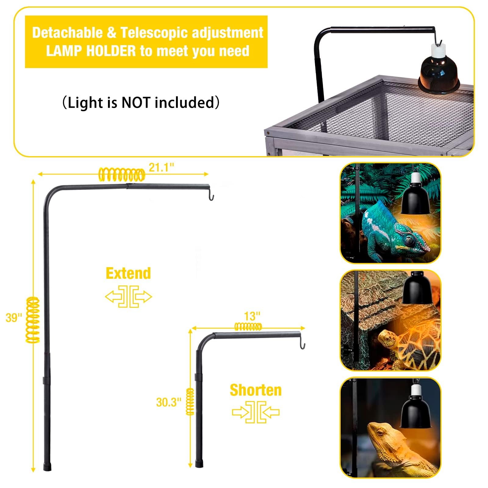 - Adjustable Heat Lamp Holder: Tortoise house comes with a adjustable light stand. Height of lamp stand: about 11"-31". Width of hanging heating lamp: about 13"-21.1". The roof is freely open with holder's 360 rotation.