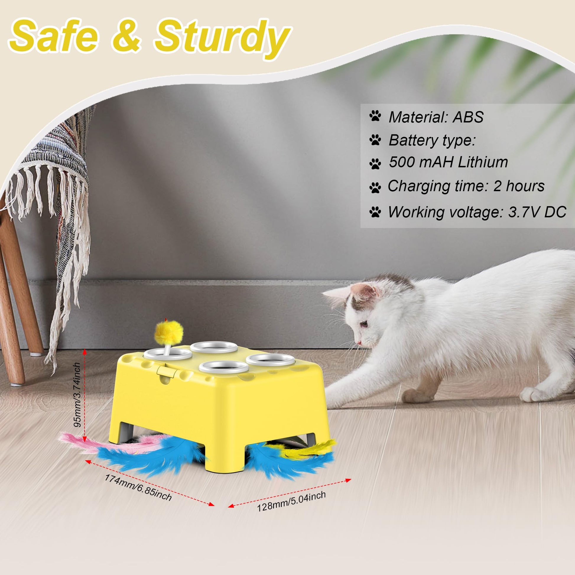 - ๐ง๏ธ๐ง๏ธใ๐ฆ๐ฎ๐ณ๐ฒ & ๐ฆ๐บ๐ผ๐ผ๐๐ต ๐๐๐ฆ ๐ ๐ฎ๐๐ฒ๐ฟ๐ถ๐ฎ๐นใWe prioritize the safety and well-being of your cats. Our cat interactive toy is made of safe and smooth ABS material, ensuring a secure playtime. The unique four-corner design provides sturdy stability, while the stylish appearance resembles a charming cheese house. It doesnโt scratch up or get damaged easily, Whether your cat likes to chew, scratch, or claw at toys, cat feather toy can handle it with ease, providing your cat with a secure play environment.