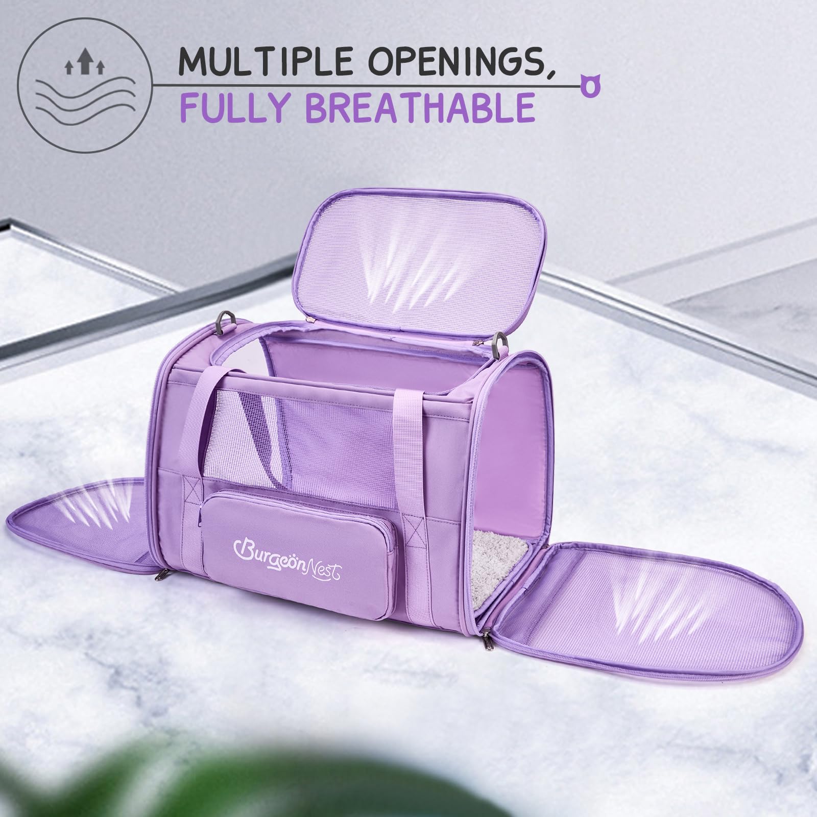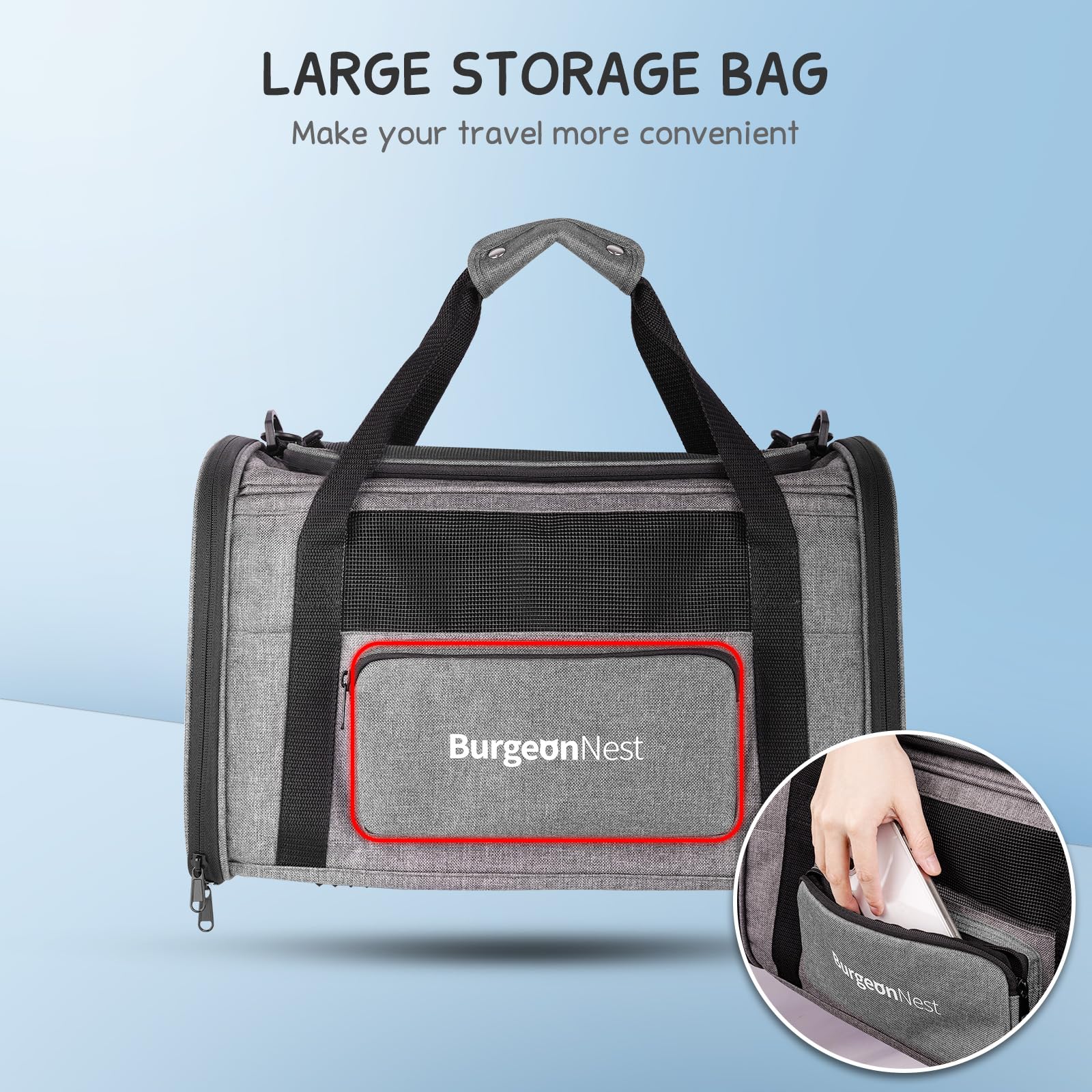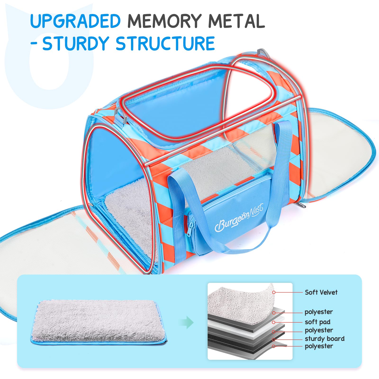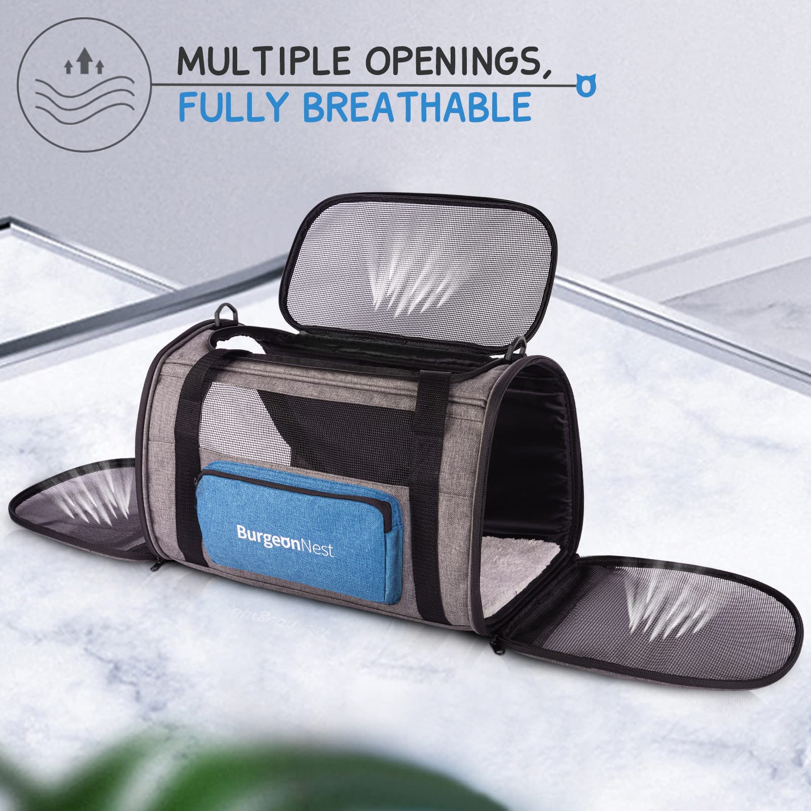 - Well-made Large Cat Carrier: With upgraded memory metal for sturdy frame, this dog carrier made of breathable fabric, BurgeonNest cat carrier has 3 doors to open, it is more convenient to put your dog cat in or out. Plush cushion with sturdy bottom inserts ensures comfortable environment for pets.