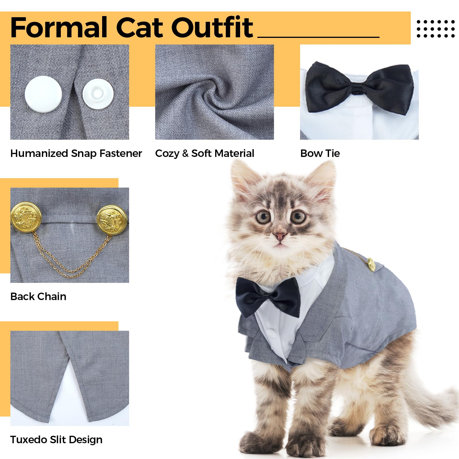 - 【Cat Tuxedo Suit Tie Outfit】Cat tuxedos are perfect for formal occasions such as weddings or special events. Turn your pet into a stylish and elegant pet, making your pet the star of the show at formal events and occasions. Fashion formal shirts are easy to match for everyday wearing, photo taking, parties, holidays, festivals. Fashionable design makes your cat distinctive and adorable. High-quality craftsmanship ensures these adorable shirt suits are suitable for indoor and outdoor pet wear.