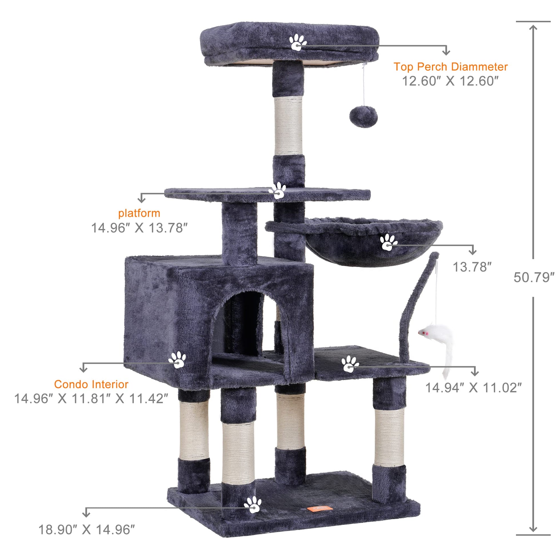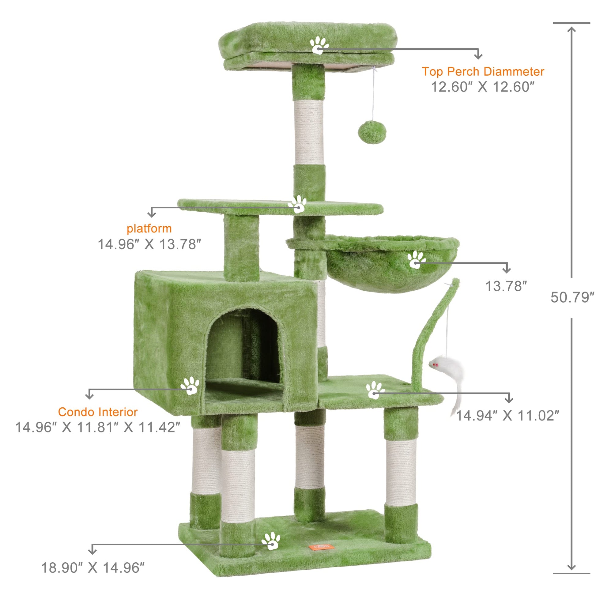 - Ideal design of structure: Structure of the cat tree is designed according the climbing habits of cats. Two jumping platforms not only increase the active space but also help kitties and older cats to climb up and down