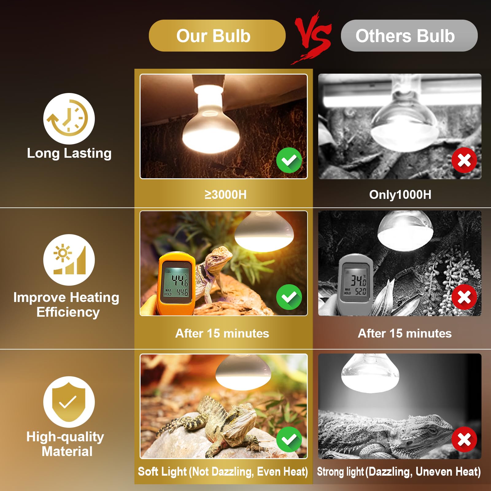 - Long-Lasting Durability: Designed with upgraded dual-filament technology, these reptile light bulbs deliver a lifespan of 3,000 to 5,000 hours—three times longer than traditional bulbs. This extended use ensures consistent heating and energy efficiency, making them a reliable choice for reptile owners.