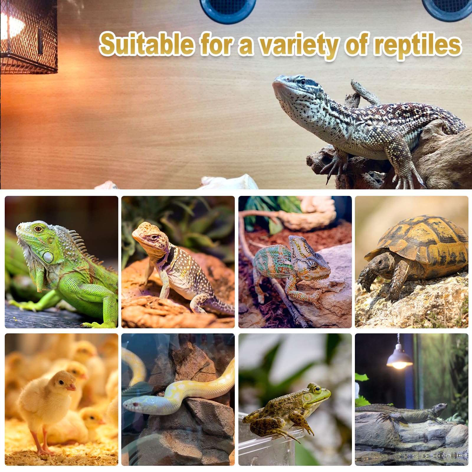 - Wide Compatibility for Multiple Species: Suitable for various reptiles and amphibians, including tortoises, turtles, bearded dragons, lizards, snakes, iguanas, geckos, chameleons, frogs, and even chickens. These basking bulbs are compatible with dimmers, thermostats, and standard 120V E26 sockets, ensuring versatility across enclosures.