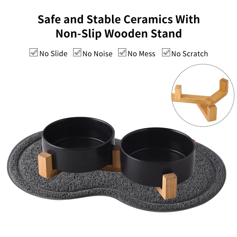 Mtlpaetm Ceramic Pet Bowls for Dog and Cat, No Spill Dog Food and Water Bowl Set with Anti-Slip Wooden Stand, Feeding Dishes Suitable for Small, Medium and Large Cats Dogs Black(850ml/29.9oz)