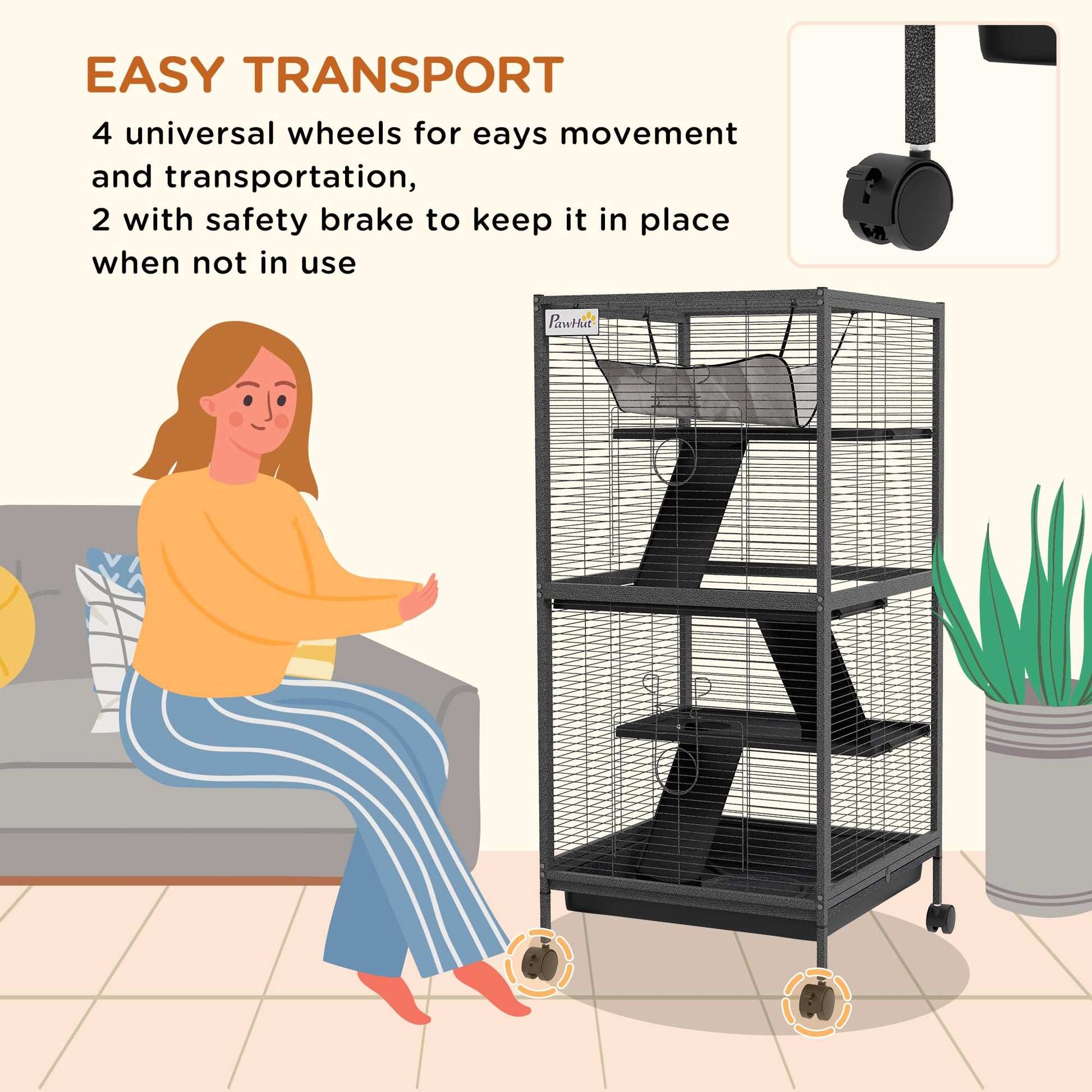 PawHut 4-Tier Rolling Small Animal Cage, Deluxe Guinea Pig Cage, Ferret Cage for Mink Chinchilla Kitten Rabbit, Small Pet Play House with Hammock Platform, Ramp, Removable Tray, Silver Grey