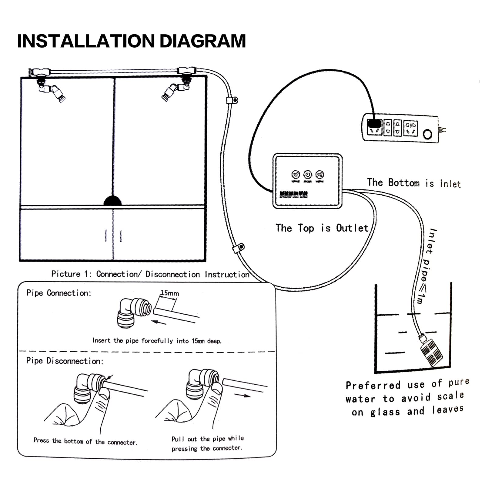 - 【MYGIIKAKA Automatic Reptile Mister】Please refer to the manual for install the reptile humidifier and pay attention to the connection of the water pipe to the water inlet/outlet. It is recommended to keep the host away from the terrarium when installing the reptile mister, to avoid affecting the reptile when the host is running.
