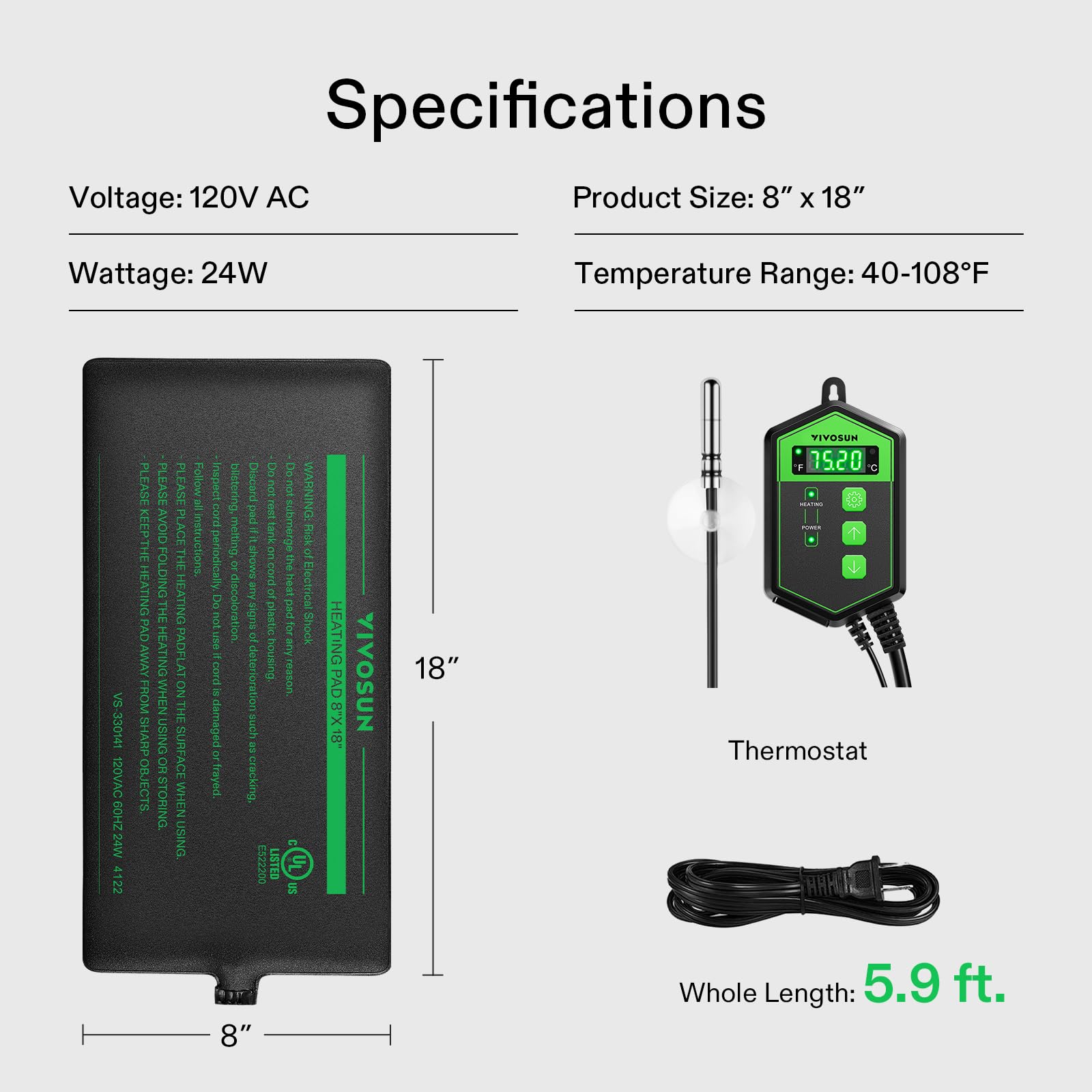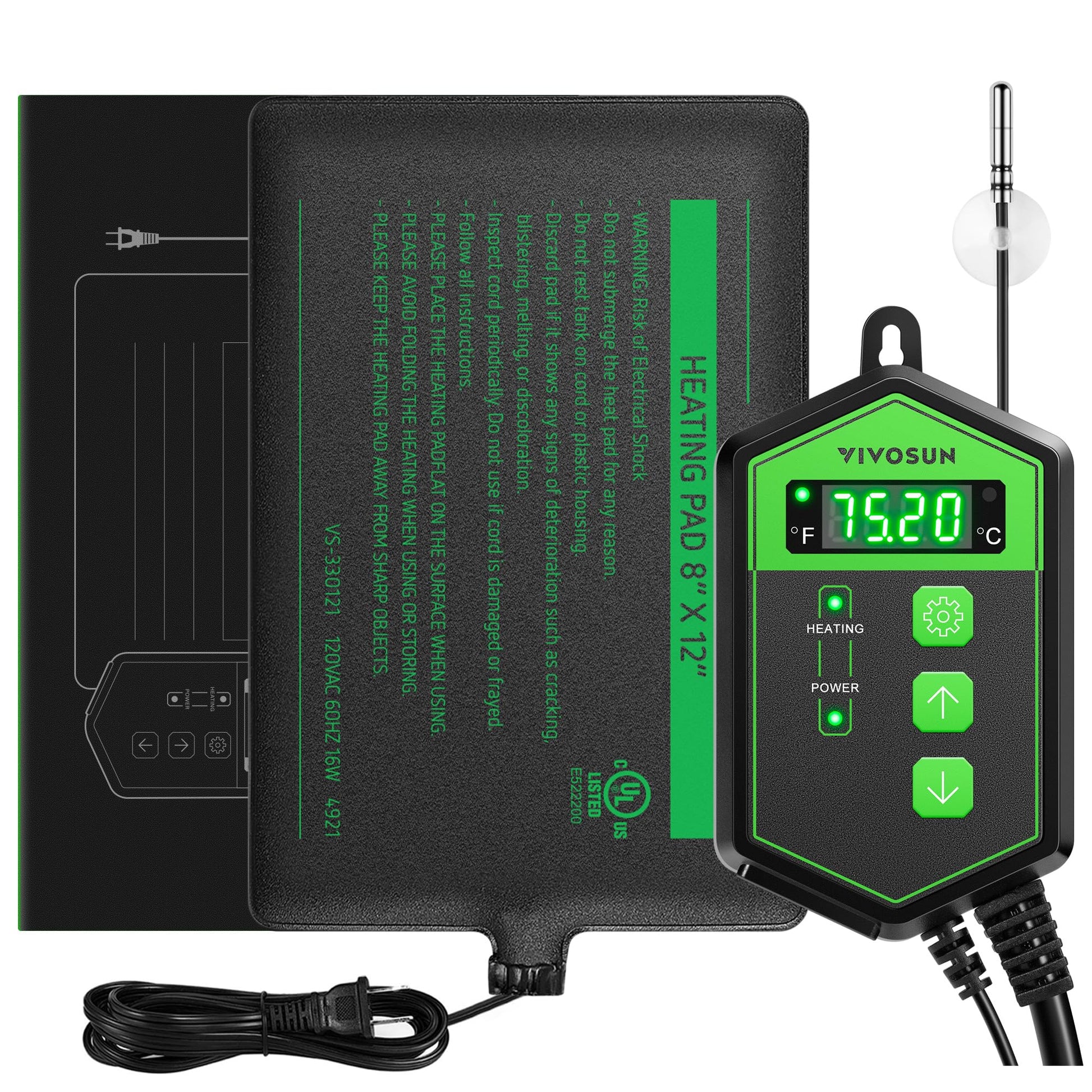 VIVOSUN Tapis chauffant pour reptiles de 15,2 x 20,3 cm avec thermostat combiné sous réservoir pour terrarium, surface imperméable pour tortues, lézards, grenouilles et autres reptiles