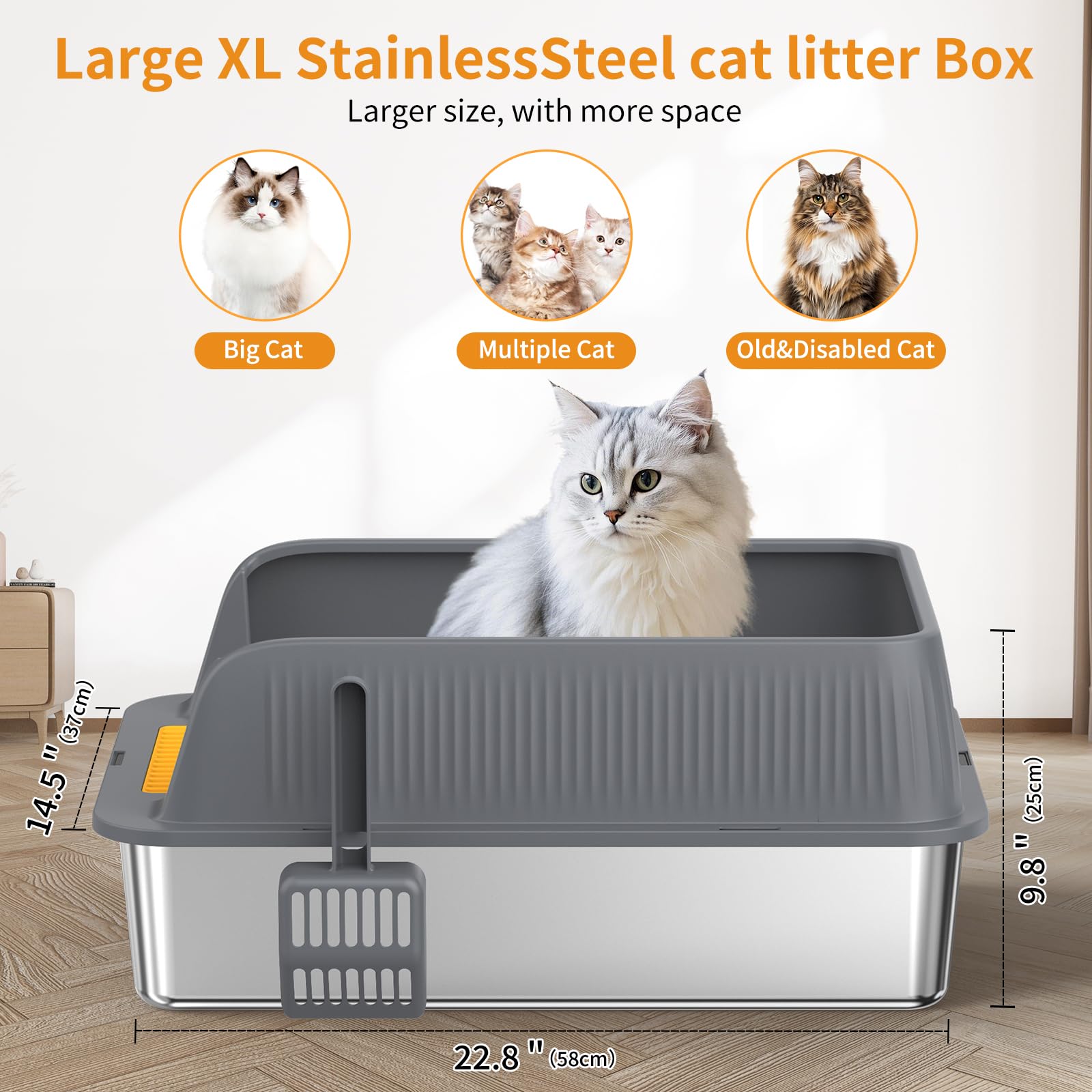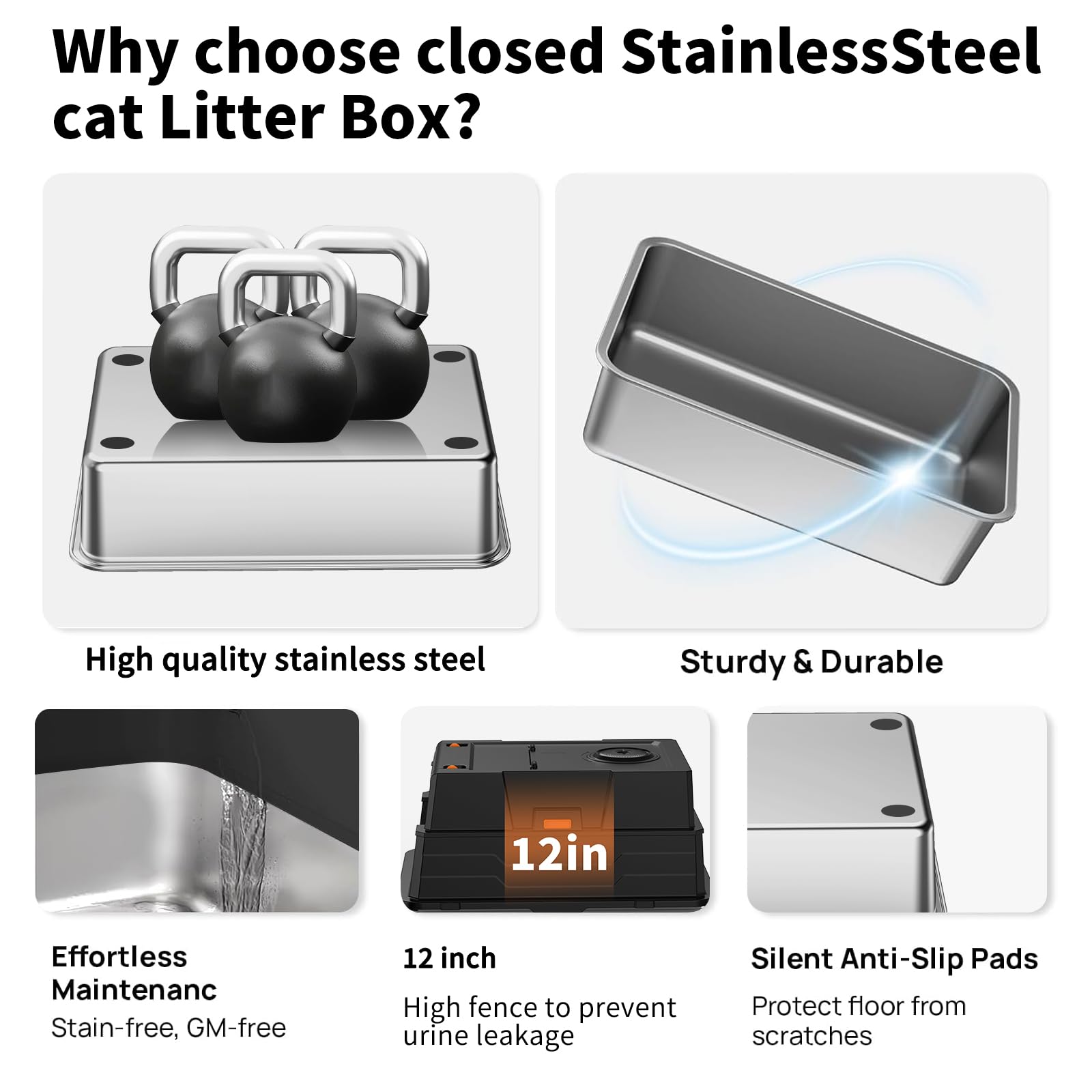 - Durable Stainless Steel Litter Box:The sturdy enclosed metal litter box is made of high quality stainless steel,the advantages of stainless steel pan are durable,long-lasting,non rusty,easy to clean and store, the life of metal litter pan is more than 5 times than other plastic litter box,can be used above 5 years