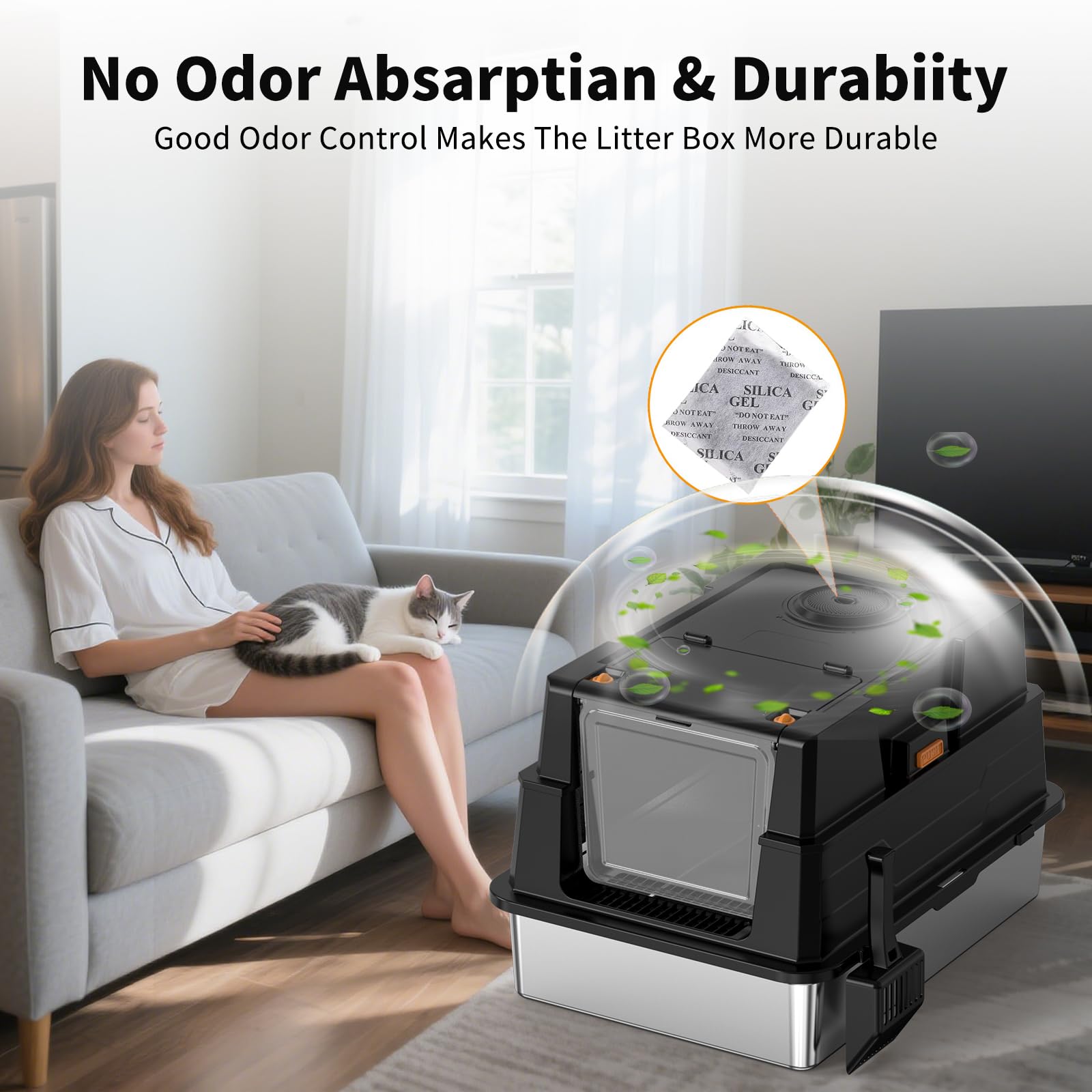 - No Odor Absorbing:The extra large metal cat litter box is no odor absorbing,better than other litter boxes,less odor In the rooms.the lump of cat litter will not stick the bottom of the metal litter box,sturdy stainless steel pan do not rusty. easy to clean and wash,making a fantastic environment